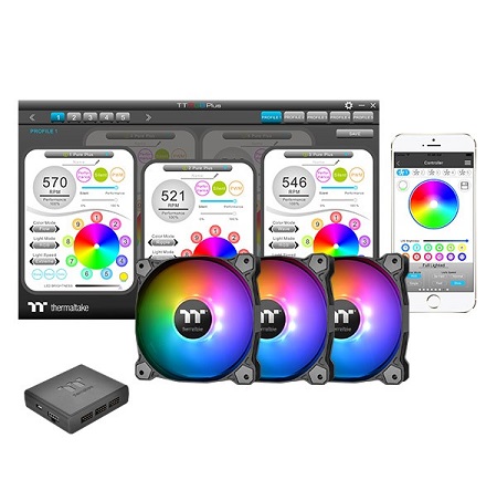 A csomaghoz mellékelt kontroller DIP kapcsolóival szoftver nélkül választható ki a tetsző szín és világítási mód. A kontroller több ventilátor beállításához alkalmas, akár több kontroller is egymásba kapcsolható. A kontrollereket a TT RGB Plus program tudja kezelni.