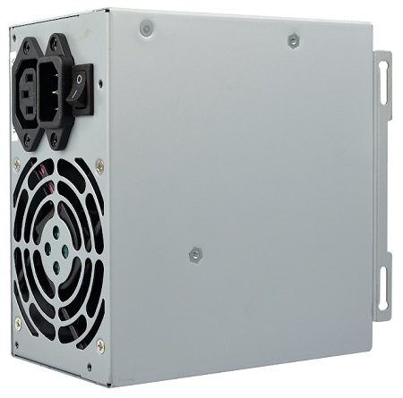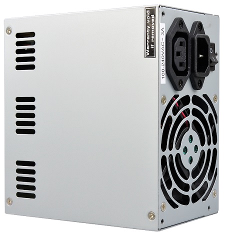 A szabványos ATX méretű tápegység hátoldalán egy 8 cm átmérőjű, golyócsapágyas ventilátor tolja ki a meleg levegőt.