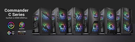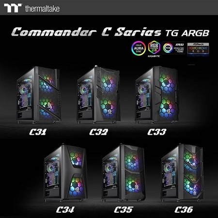 A Commander C sorozat ATX méretű, közepes magasságú számítógépházakból áll. Temperált üveg oldallap engedi a betekintést a belső térbe. A hálós előlap mögött gyárilag beépített két darab 200 mm-es ARGB ledekkel megvilágított ventilátor nyűgözi le a szemlélődőt. Ennek a megvilágított front panelnek az a szerepe, a számítógépet felruházza a játék szellemiségével. Olyan dizájn elemekkel szerelték fel a klasszikus Thermaltake vázat, amellyel a gamerek széles körét megragadhatják. Hat különböző modell alkotja a családot.