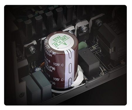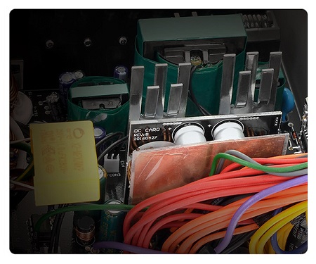 A tetszetős dobozban magas minőségű alkatrészekből állították össze az energiaforrást. A legfontosabb kapacitások Japánból származnak, magas hőmérsékletig állják a sarat és biztos feszültséget szolgáltatnak.
