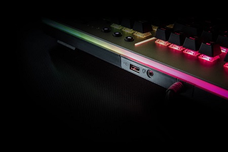 A billentyűzet felső élén, kézre eső helyen található egy USB port és egy audió csatlakozó a kényelem fokozása érdekében.