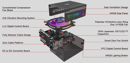 A teljes nevén Toughpower PF1 ARGB Platinum Premium Edition anyakönyvezett tápegységbe a kakaót a prémium alkatrészek adják. No meg az a fejlett technológia, ami a teljesítmény és a megjelenés egybegyúrásáért is felelős.