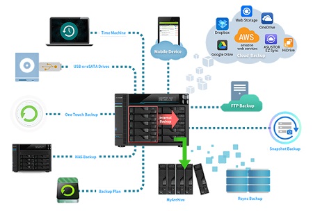 Az ASUSTOR NAS-on sokféle mentési opció közül lehet választani, például egy nyilvános felhőszolgáltatóhoz, egy myArchive kötetre vagy egy második NAS-ra, illetve valamilyen külső tárolóeszközre elhelyezve az adatokat. A fenti 3-2-1 módszer könnyen beállítható, automatizálható.