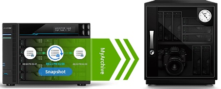 A MyArchive úgynevezett cold backup technológiája a merevlemezt olyan tartalék meghajtóvá változtatja, amely gyorsan, a NAS leállítása nélkül üzembe helyezhető ismét és bármikor el is távolítható. Gond nélkül használható offline biztonsági másolatok készítéséhez.