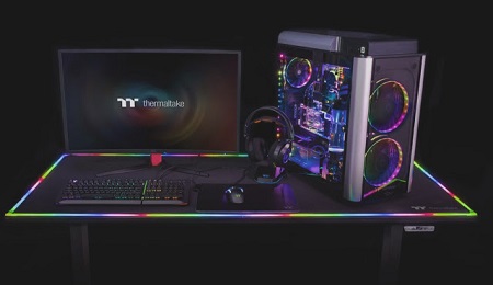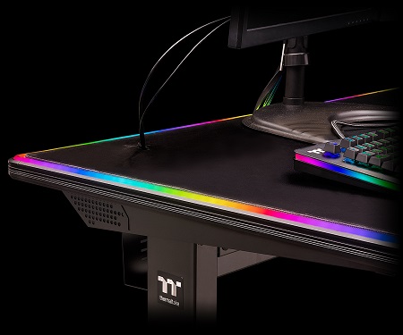 Induljunk onnan, hogy az asztal teljes felülete egy hatalmas egérpad (Level 20 RGB változat). A szegélyen pedig körben ott az RGB világítás, melyet az iTAKE programmal igazíthatsz a többi világító eszközödhöz vagy akár az TT RGB PLUS szoftveren keresztül is beállíthatod a színeket. Így az asztal világítása beilleszthető a többi RGB fényforrás közé.