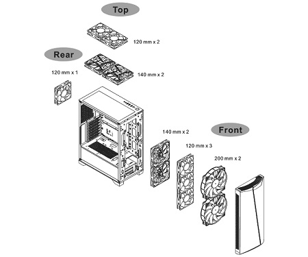 A hátulra már gyárilag betelepített 12 cm-es ventilátoron túl előre két 20 cm-es széllapát, a ház tetejére pedig még kettő 140 mm-es kerülhet. Hűtőradiátorokból előre 360 mm, felülre 240 mm méretűek rakhatók.