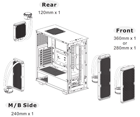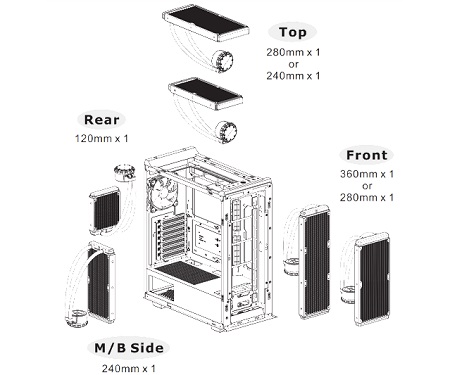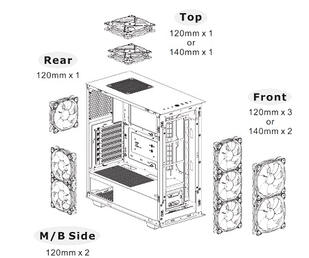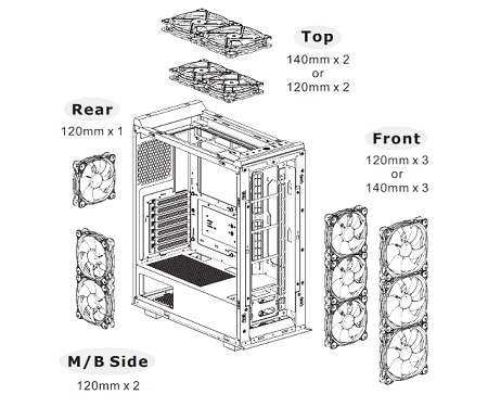 Telepítve van már két 120 mm-es szabványos ventilátor elöl és hátul a teljes hűtési környezet érdekében. Ezen felül akár egy 140 mm-es ventilátort is elhelyezhető a tetején, és két 120 mm-es ventilátort az alaplap jobb oldalán.