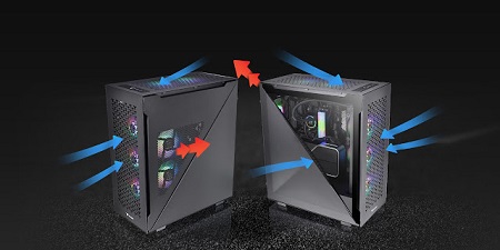 Ami a hűtési megoldást illeti, a mindkét Divider TG Air-ben előre telepítve van már egy 120 mm-es standard első ventilátor a hideg levegő beszívásához és egy 120 mm-es szabványos hátsó ventilátor a meleg levegő elszívásához.