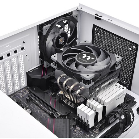 A TOUGHAIR 110 magassága 114 mm, úgynevezett felső légáramú hűtő: a levegő a processzorra merőlegesen érkezik a hűtőbordákhoz. Akár 140 W féken tartására is alkalmas. A felső áramlású kialakítás az alaplap egyéb alkatrészeinek hűtésében is előnyös, miközben természetesen hűti a CPU-t is.