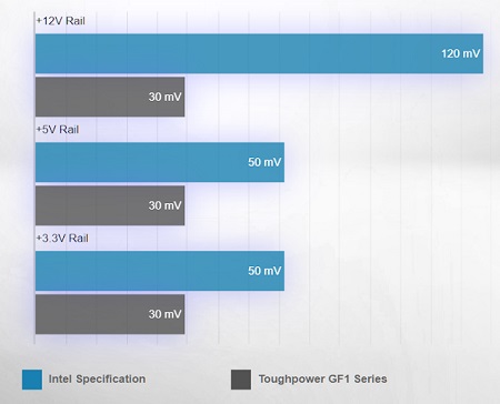 A Toughpower GF1 sorozat az akár 90%-os energiahatékonyságának köszönhetően energiát takarít meg. 80 PLUS® Gold minősítéssel rendelkezik. A sorozatot úgy optimalizálták, hogy az Intel processzorainak minden generációjával működjön a maximális energiamegtakarítás érdekében.