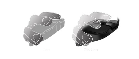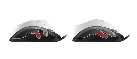 A karmos megfogásnál a homorú ívű kialakítás jobban megtámasztja az ujjakat, így a felhasználók a ezzel a fogásmóddal is könnyedén felemelhetik az egeret.