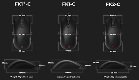 A Zowie FK sorozat a szimmetrikus - azaz jobb- és balkezesek által is használható - széria, úgynevezett alacsony profil kialakítással. Az alacsony profil jobb irányítást biztosít mind a karmos, mind a tenyér markolat fogású felhasználók számára. Több helyet nyújt a tenyér és az egér teteje között, ami lehetővé teszi a fogás finomhangolását. A FK család új modellekkel bővült, FK1+-C, FK1-C és FK2-C típus megnevezéssel, amely a méretkülönbségek jelöli. Az új C verzió súlycsökkentést, paracord kábelt és 24 lépéses görgőt tartalmaz a különböző személyes preferenciák érdekében, valamint 3360 szenzorral kerültek felszerelésre.