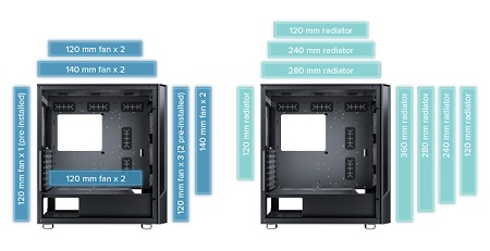 Rengeteg lehetőség áll rendelkezésre a tárolási és hűtési konfigurációkhoz. A ház elejére és hátuljára három ventilátor előre már előre telepítve, amelyek optimális légáramlást biztosítanak. A bővített opciók révén a ház összesen nyolc darab 120 mm-es hűtőventilátorral, valamint különféle folyadékhűtési megoldásokkal szerelhető fel.