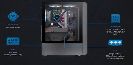 A ház bal oldalán levő 3 mm-es edzett üvegpanel vastagabb és karcállóbb, mint a normál akril. Ráadásul a megnövelt ablakkialakítás révén az összes alkatrész teljes RGB pompája látható és megcsodálható.