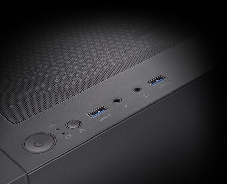 A kezed ügyében, a ház felső részén két USB 3.0 port, egy HD Audio és egy reset gomb található.