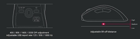 A csatlakozásához driverrre nincs szükség. Az USB port mintavételezési frekvenciája 125 / 500 / 1000 Hz-re állítható. A DPI választék: 400, 800, 1600 és 3200 DPI. Az elemelés magassága három fokozatban (low, midium és high) állítható.