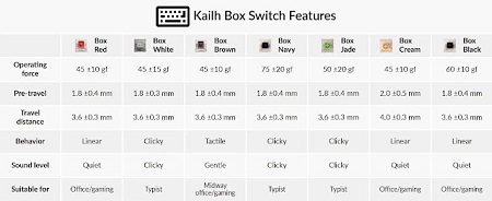 A Cherry MX formával és a kereszt körüli Box dizájnnal kombinálva a Kailh Box kapcsolók lleszkednek bármely MX stílusú billentyűsapkához és nagymértékben csökkentik a kotyogást, amellyel javítják a gépelési élményt. A Kailh Box normál kapcsolókon kívül a Box Jade, Box Navy és Box Cream is csatlakozik a családhoz.