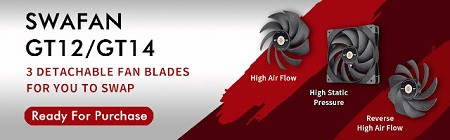 A SWAFAN GT12 / 14 PC hűtőventilátor család a Thermaltake első , nem RGB-s ventilátora, amelynek lapátjai cserélhetők. A SWAFAN GT csomag nem kettő, hanem háromféle cserélhető ventilátorlapátot tartalmaz, óriási rugalmasságot biztosítva többféle PC építési forgatókönyvhöz. Ráadásul a SWAFAN GT sorozat egy új, egymásba láncolható kábeles kialakítással rendelkezik, amely minimalizálja a kábeligényt és szabadabb utat hagy a levőáramlásnak.