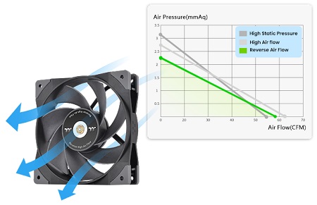 A fordított, nagy légáramlású ventilátorlapát a ventilátor keret hátsó oldala felöl az előlapja irányába juttatja a levegőt. Ennek az az értelme, hogy a ventilátor keret kiépítése nélkül megfordítható legyen a légáramlat iránya és esztétikai célja, hogy ne egy hátat fordított ventilátort kelljen nézegetni a házban. Az áramlás irányától függetlenül mindegyik beszerelt ventilátor pont ugyanúgy néz ki, mint a többi.