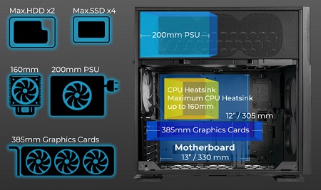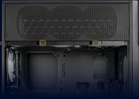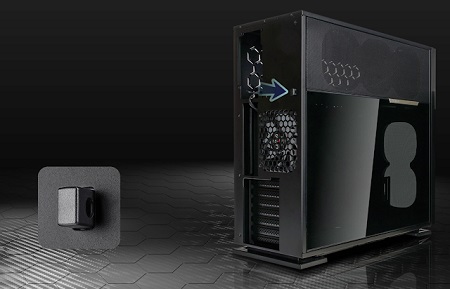 Az oldalsó panel feletti hálós részt egy mágneses zárja tartja, a két mutatóujj és egy egyszerű forgató mozdulat segítségével pillanatok alatt lehajtható. Sokoldalú GPU kártya tartó óvja a nehéz és hosszú videókártákat a megereszkedéstől.
