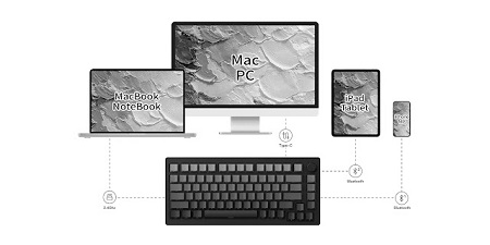 Az Akko Monsgeek M1W-SP háromféle módon képes kapcsolódni. A multi mód magába foglalja a 2,4 GHz-es vezeték nélküli kapcsolatot és a BT 5.0-t,a mellyel egyszerre három eszközhöz, mondjuk tablethez. számítógéphez és egy telefonhoz kapcsolódhatsz. Aki a vezetékes üzemmódot jobban szereti, annak az USB-C vezetékes mód nyújt gyors válaszidőt és minimális laggolást az FPS játékokhoz.