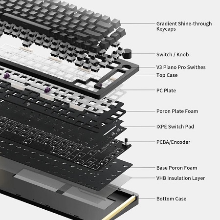 Már a csinos külső alatt van, de egy mechanikus billentyűzet értékéhez nagyon nagy mértékben hozzájárulnak a szerkezeti elemek is: gasket mount plate felfüggesztés, a plate mounted stabilizerek, az N-key rollover és a poron rezgéscsillapító plate foam. Prémium megoldások mind, sima és csendes gépelési élményt nyújtanak.