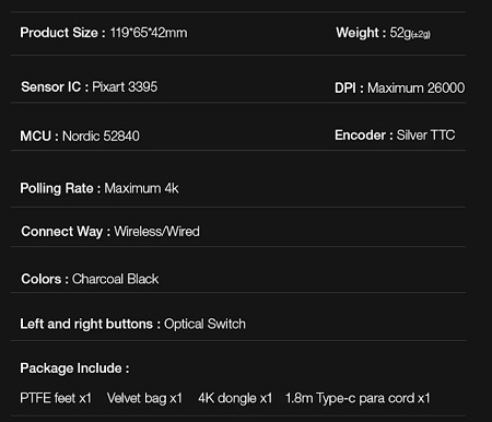 A Lamzu Thorn gamer egér szuper könnyű. Vezetékes és vezeték nélküli (2,4G Hz) üzemmódban is használhatod. Nagyszerű funkciókkal rendelkezik: Pixart 3395 otikai érzékelő, hosszú akku idő, Nordic 52840 MCU, tökéletes tappancsok és M1 / M2 optikai kapcsolók. Játékrajongóknak mondjuk: 26000 DPI és 4 kHz mintavételezés!