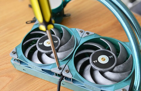 A Thermlatake TOUGHLIQUID 240 ARGB Sync türkiz és versenyzőld All-In-One folyadékhűtők radiátora 240 mm hosszú, amelyen kéd darab 12 cm-es TOUGHFAN típusú ventilátor préseli át a levegőt.