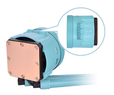 A vizesblokk, a pumpa a processzor felületével teljes terjedelemben, egy réz lappal kapcsolódik. A blokkon levő ARGB kijelző elforgatható, hogy a TT logó mindig rendezetten, vízszintesen jelenjen meg. A világítási effekt vagy a blokk oldalánlevő kapcsolókkal vagy a kompatibilis alaplap világítási szoftverén keresztül választható ki.