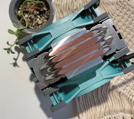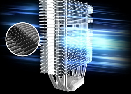 A jobb légáramlás végett áttervezett hűtőlemezek között négy darab, hat mm átmérőjű hűtőcső fut végig, amelyeken a két ventilátor közös erővel préseli át a nagy nyomású levegőt. A hűtőcsövek a hűtő talpazatán úgy fordulnak meg a túloldalra, hogy közvetlenül érintkeznek a hűtőpasztával és a processzor felületével.