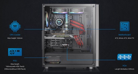A Thermaltake V250 TG ARGB közepes méretű toronyház még a kompakt mérete mellett is helyet ad a a szabványos ATX alaplapnak és úgy tervezték, hogy támogassa a csúcskategóriás bővítéseket, ezzel felelve meg minden felhasználó egyéni igényeinek.