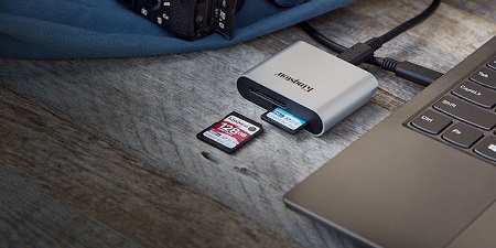 A csomag tartalma: két kártyafoglalatos SD olvasó, USB-C / USB-C kábel, rövid útmutató
