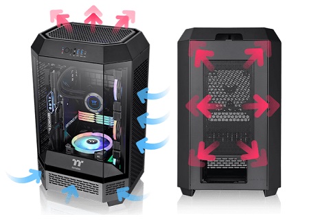 A különleges, nyolcszögű alakja kisebb helyet foglal és lehetővé tesz a maximális helykihasználást. A Tower 300 kiemelkedő hűtési képességgel rendelkezik, például egy 420 mm-es AIO hűtővel a jobb oldalon, nyolc darab 120 mm vagy 140 mm-es ventilátorral, illetve vízhűtéssel.