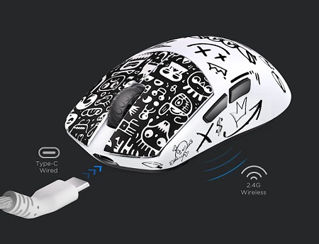 Az egér vezeték nélküli 2,4G (megfelelő vevővel 8K) kapcsolatra képes, de egy Type-C kábellel vezetékes módban (1K polling rate) is használható, illetve a kábelen keresztül tölthető.