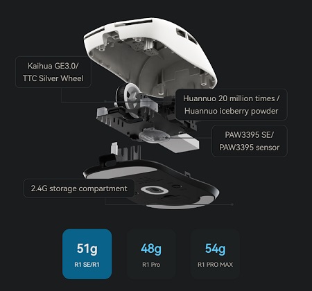 A görgő mozgását TTC ezüst érzékelő követi és a Kaihua GE3.0 kapcsoló. A gombjai alatt az R1 SE, R1 és R1 Pro modellekben Huanno Iceberry Powder kapcsolók vannak. Puha, rugalmas tapintású, nem okoz fáradtságot hosszú távon sem, 90 millió kattintásra méretezett. Az R1 Pro Max kapcsolói Kahua's Sword névre hallgatnak. Mérsékelt érzés, kényelmes visszajelzés, elsőrangú a játékhoz. 100 millió kattintás a tervezett élettartama.