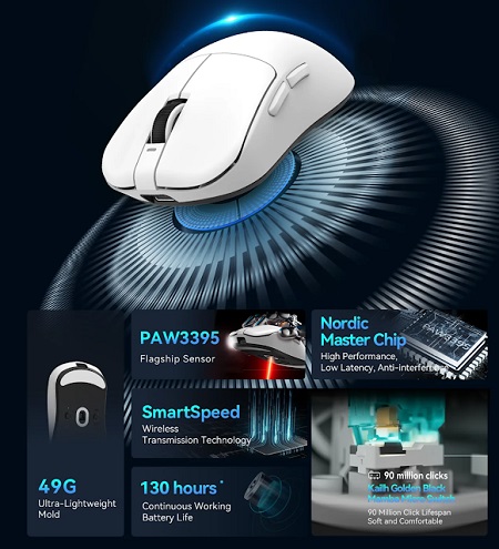 SMARTSPEED X vezeték nélküli átviteli technológia a VXE saját fejlesztésű átviteli technológiája a skandináv fő vezérlő chip mélyreható kutatásán és fejlesztésén alapul. Alacsony késleltetést, megduplázott akkumulátor élettartamot és a lehető legjobb játékeszközt eredményezi, a játékélmény vetekszik a vezetékes egerekével.