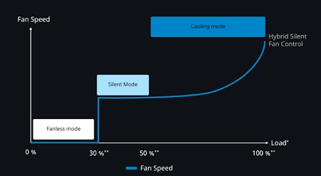 Az egyik kiemelkedő tulajdonsága a hibrid (S3FC) ventilátorszabályozás, amely alacsony terhelésnél teljesen lekapcsolja a ventilátort, biztosítva a néma működést. Nagyobb igénybevétel esetén pedig a ventilátor fokozatosan gyorsul, hogy megfelelő hűtést biztosítson a komponensek számára, de minimalizálja a zajszintet.