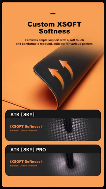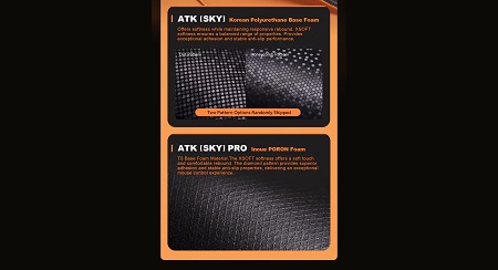 Az ATK Sky koreai poliuretán alaphabra épül. Ez az anyag puha tapintású, miközben biztosítja a határozott visszarugózást. Az XSOFT puhaságának köszönhetően a tulajdonságok egy kevert, de kiegyensúlyozott skáláját mutatja, például a kiváló tapadást és a stabil csúszásgátló teljesítményt együtt. Ezenkívül fokozza a kéz lekövetésének érzését, ideális a precíz vezérlést igénylő felhasználók számára.