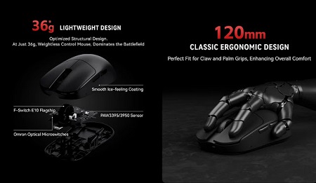 A lehető legjobb hardver elemeket pakolták a kis egérbe. Az F-Switch E10 görgő érzékelők és az Omron optikai mikrokapcsolói felelnek az információbevitelért. A mozgást a PAW3395 és PAW3950 érzékelők követik le.