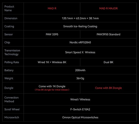 A VXE MAD R sorozat két változatban érhető el: MAD R és MAD R Major. Mindkét modell 200 mAh-s akkumulátort tartalmaz, amely körülbelül 60 óra üzemidőt tud biztosítani 1000 Hz-es lekérdezési frekvencián. Vedd figyelembe, hogy a 8K mintavételezési frekvencia engedélyezése jelentősen csökkenti az akkumulátor élettartamát.