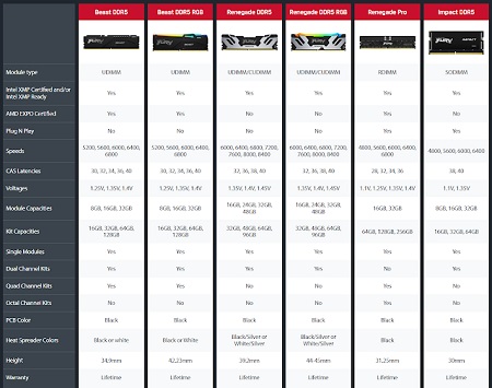 A Kingston DDR5 moduljai közül a játékosoknak szánt változatok családja a FURY. A FURY portfólió asztali számítógépekben használt DIMM modulok esetében két teljesítmény kategóriából áll: Beast és a Renegade. E két teljesítmény osztály további termékvonalakat tartalmaz.