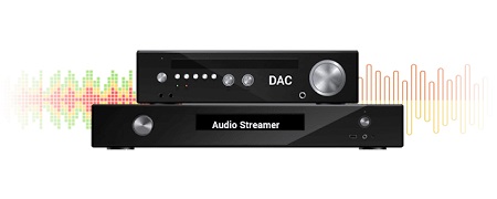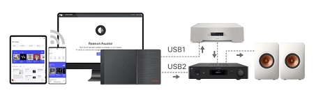 A rendszer felépítése rugalmasan alakítható az otthoni igényekhez. Ha rendelkezel digitális streamerrel, akkor USB-n vagy egy különálló DAC-on keresztül tudod a jelet továbbítani a lejátszóhoz, így a zene a lehető legjobb minőségben szólal meg. Ha nincs külön streamer, akkor a DAC közvetlenül a NAS-hoz is csatlakoztatható, és az analóg jelet innen egyszerűen eljuttathatod aktív hangfalakhoz vagy erősítőhöz.