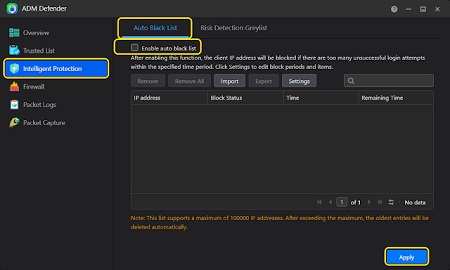 Az adaptív feketelista automatikusan blokkolja a gyanús IP-címeket. Az IP-kockázat felismerésével azonnal leállítja a veszélyes kapcsolatokat, mielőtt azok kárt okoznának.