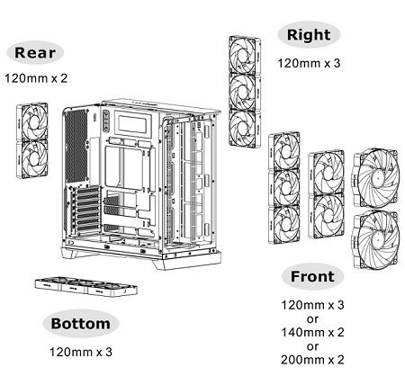 A ház akár tizenegy 120 mm-es ventilátort vagy két 200 mm-es elülső ventilátort is fogad, valamint 360 mm-es radiátorokat a fronton és az alaplap oldalán is.