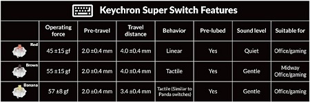 A Super Banana szintén taktilis, de karakteresebb visszajelzéssel. A működtetési erő kb. 57 gf, a teljes út rövidebb, 3,4 mm, ami gyorsabb visszatérést és határozottabb leütési érzetet ad. A karaktere a Panda típusú kapcsolók világát idézi, de gyárilag kenve, kontrollált hanggal. Gépelésorientált felhasználásra különösen jó, ahol fontos a ritmus és a visszajelzés, de játék közben is stabil és kiszámítható.