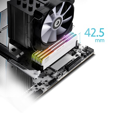 Külön figyelmet érdemel a fizikai kialakítás. A hűtőborda letisztult, alumínium felépítésű, a modul magassága 42,5 mm, ami jó kompatibilitást biztosít a nagyobb léghűtőkkel is. A dupla fénycsíkos RGB világítás nem tolakodó, inkább egységes, prémium hatást kelt, és gond nélkül integrálható az alaplapok RGB vezérlőszoftvereibe.