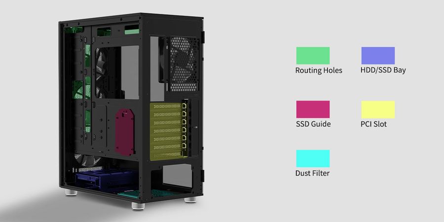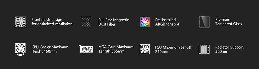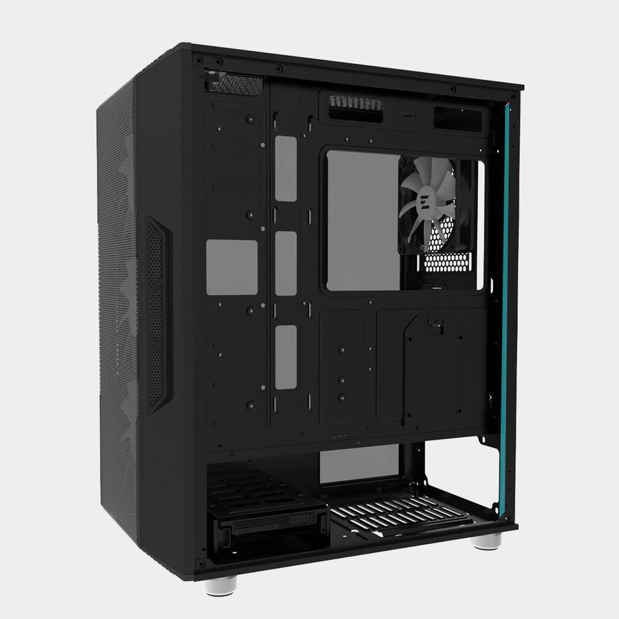 4 előre telepített 120 mm-es ARGB ventilátor (elöl 3 db, hátul 1 db) és optimalizált szellőzés, amely gyors hőelvezetést biztosít a házban (akár 8 ventilátort is támogat)