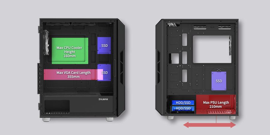 Tápegység maximális hosszúsága: 210 mm (meghajtórekesz nélkül: 350 mm)