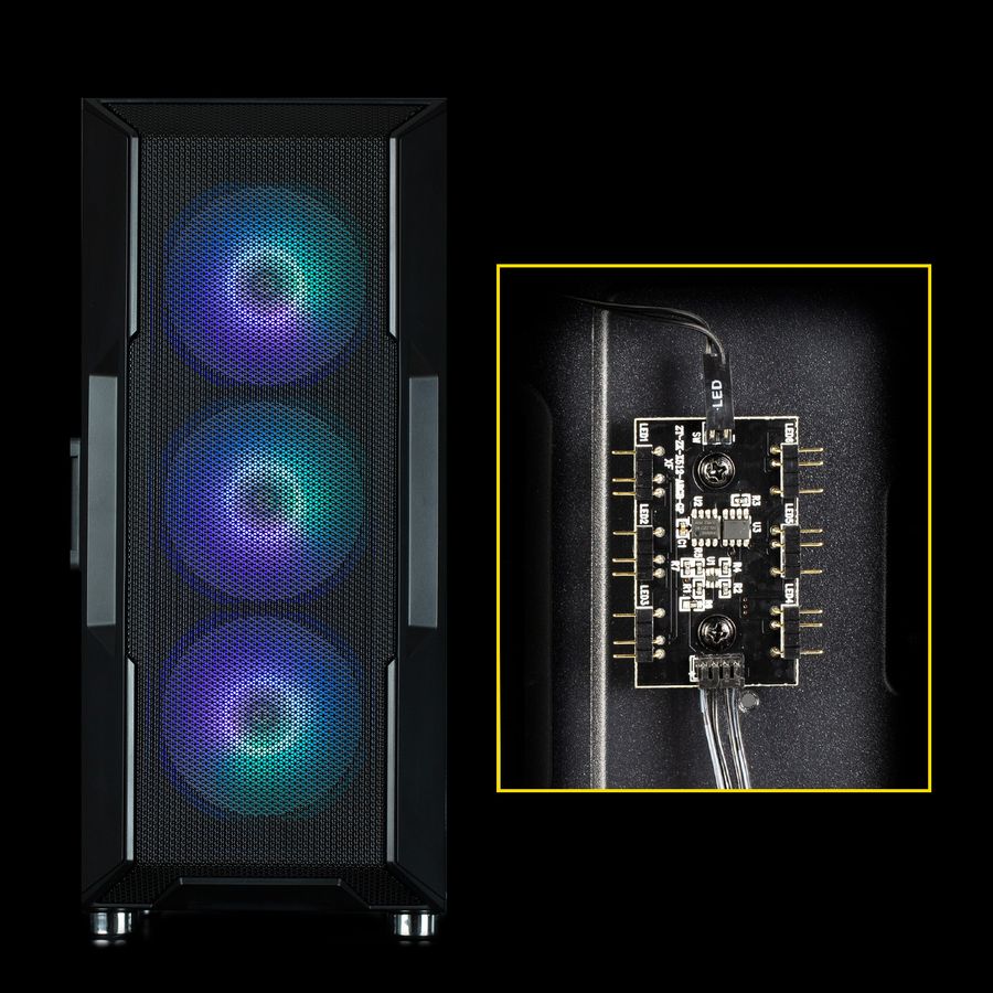 Az elülső hálós panel és az RGB ventilátorok optimális légáramlást és lenyűgöző ARGB fényhatásokat biztosítanak (akár 8 ventilátort is támogat)